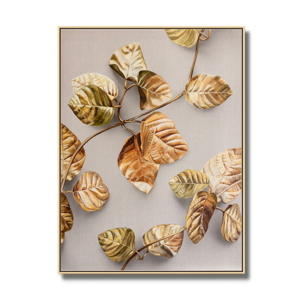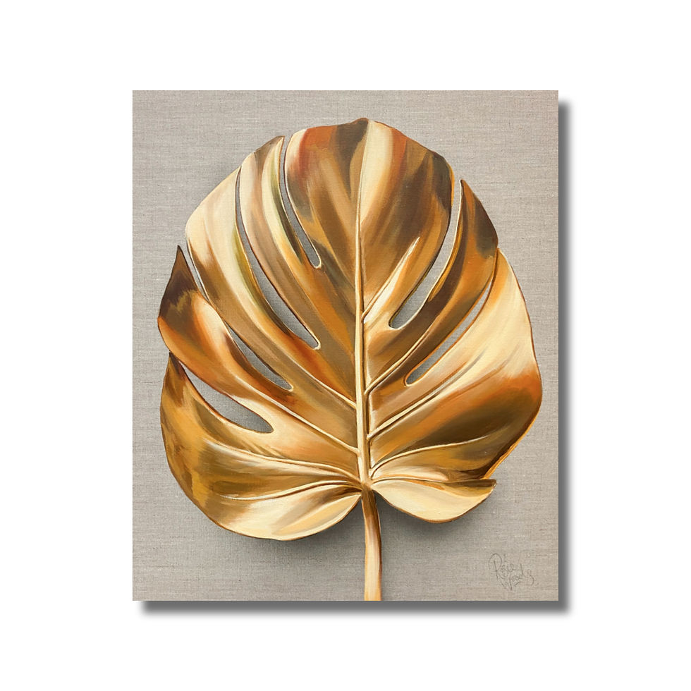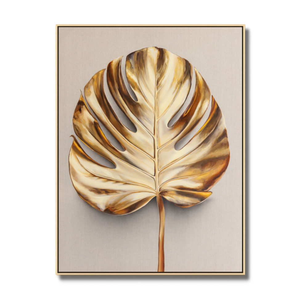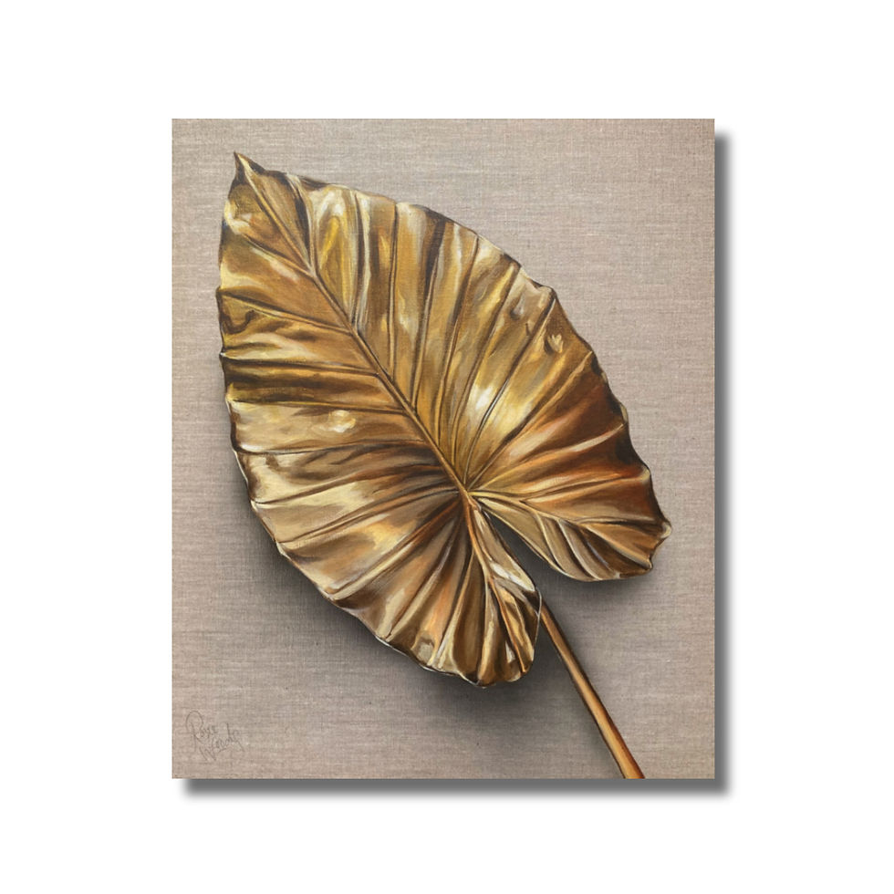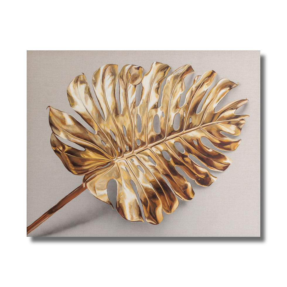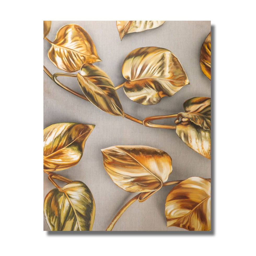 The exhibition unfolds through two connected bodies of work. The first is a series of botanical paintings: individual leaves that glow gold on raw, unprimed linen. Monstera, maple and alocasia -familiar forms often overlooked in daily life- are given scale and reverence with an intimate observation that is almost devotional.