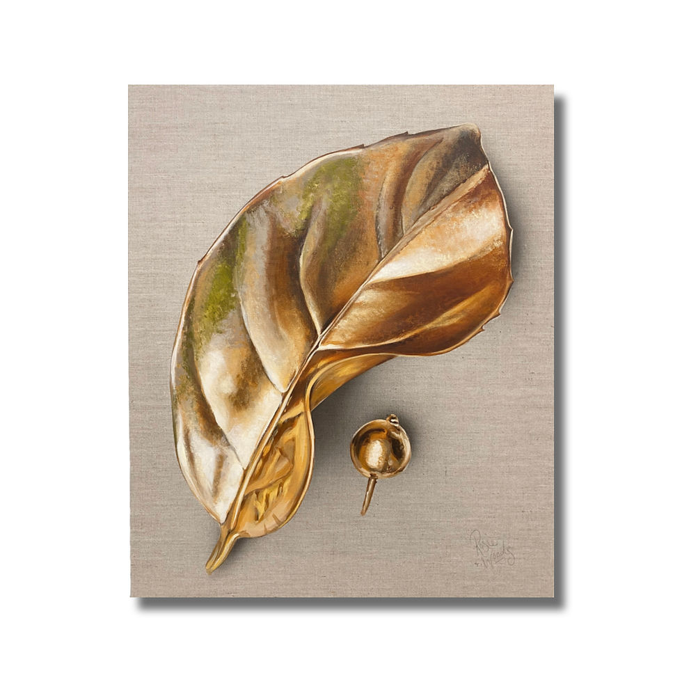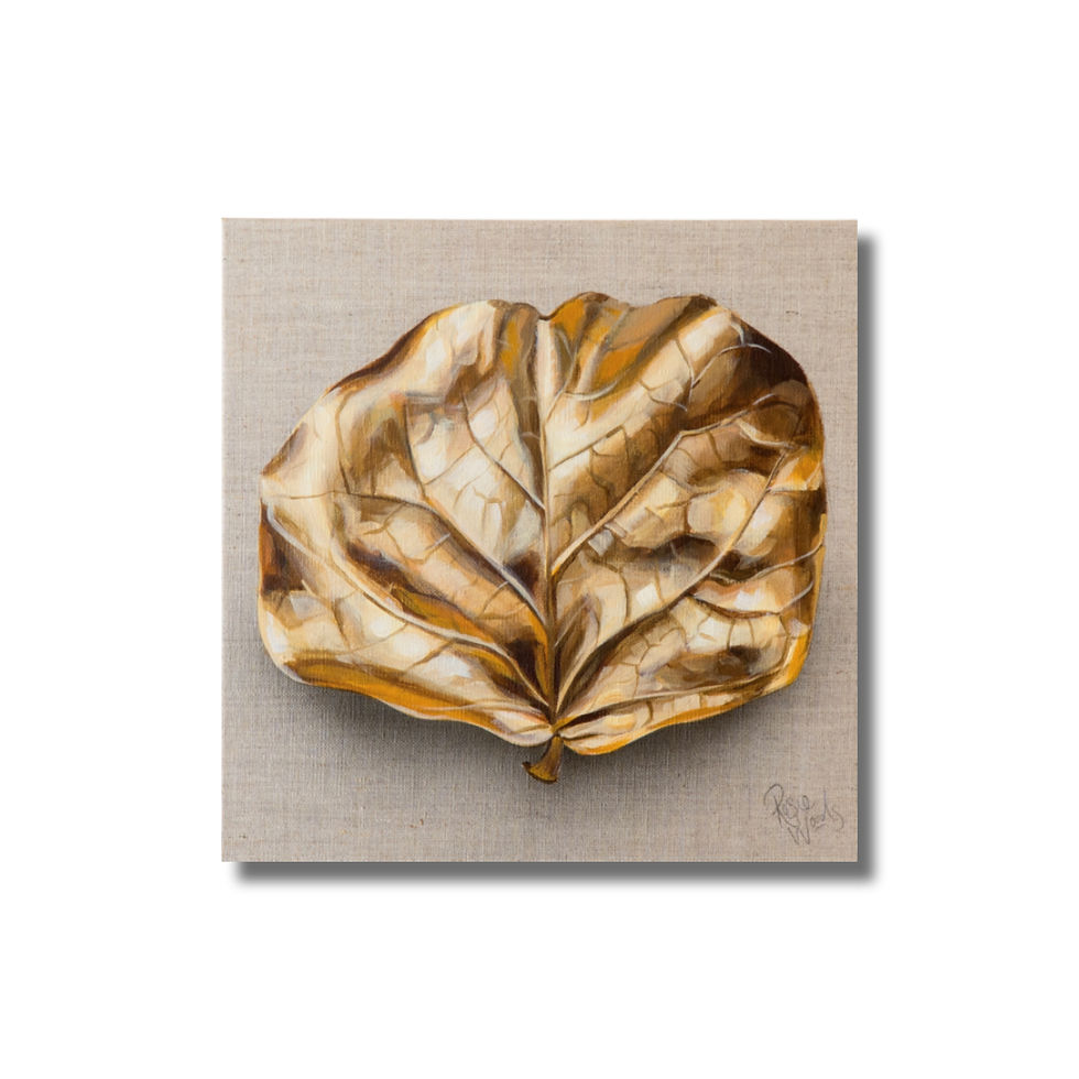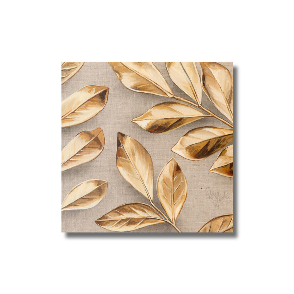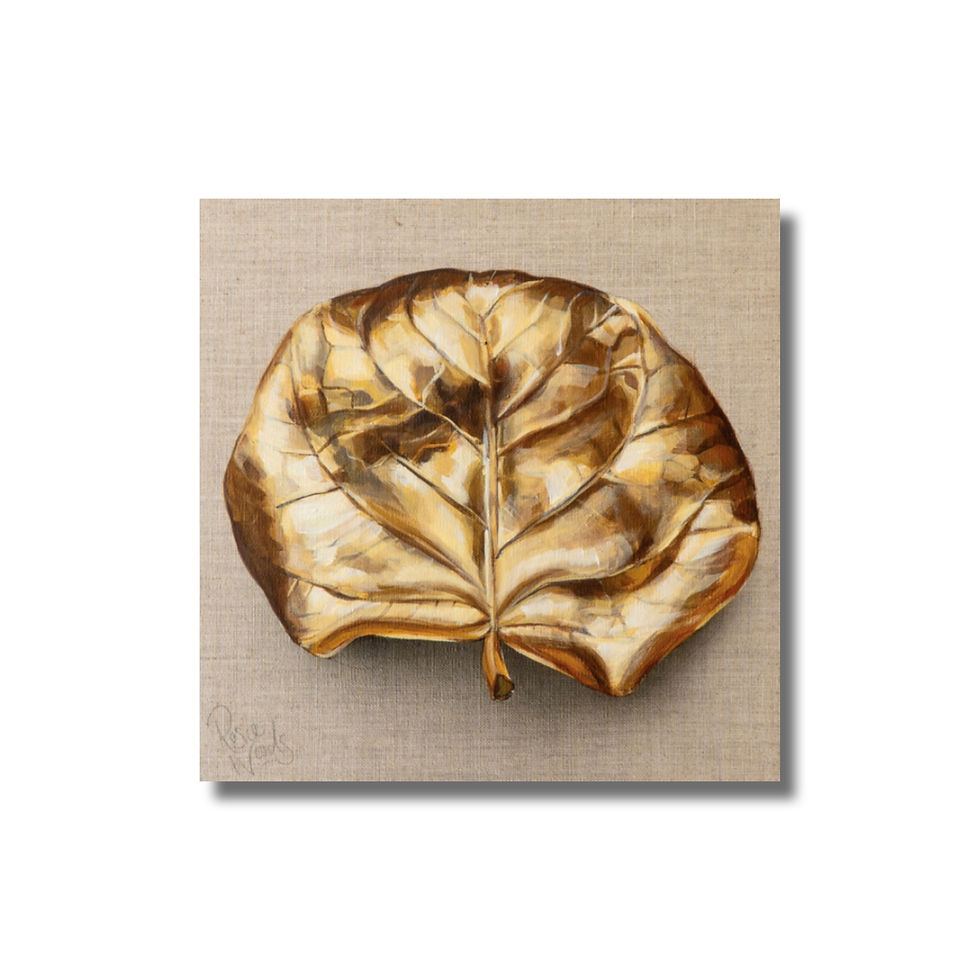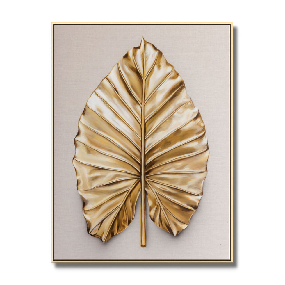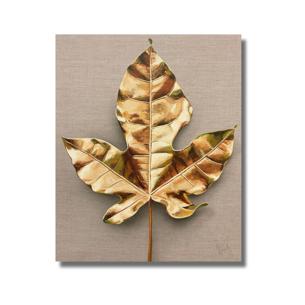 The exhibition unfolds through two connected bodies of work. The first is a series of botanical paintings: individual leaves that glow gold on raw, unprimed linen. Monstera, maple and alocasia -familiar forms often overlooked in daily life- are given scale and reverence with an intimate observation that is almost devotional.