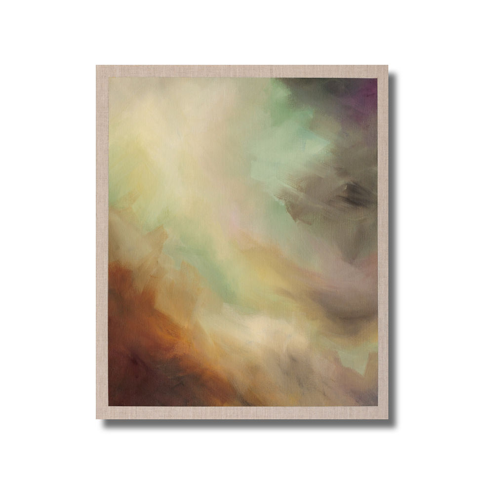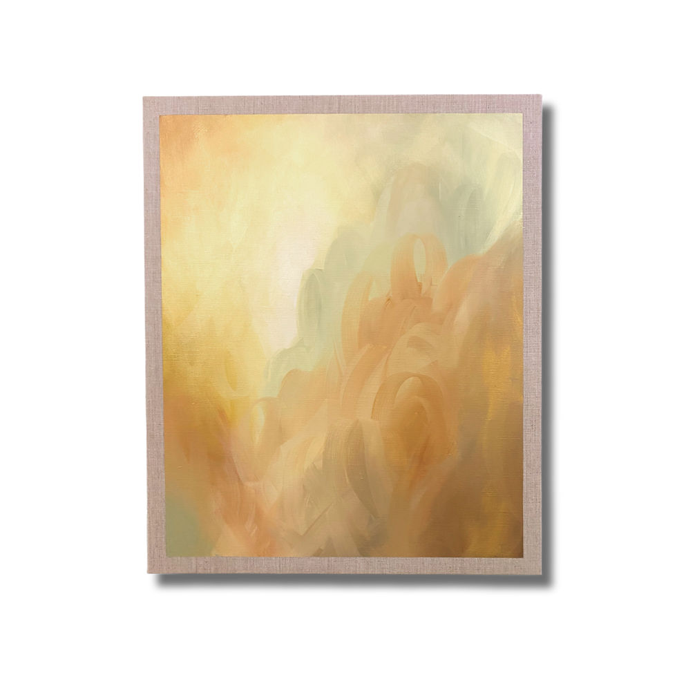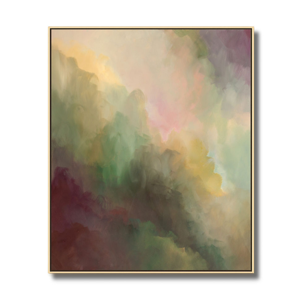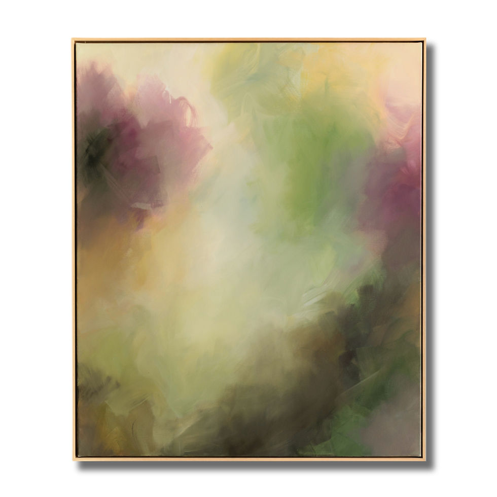 Alongside these are a series of looser, atmospheric abstract works that feel like landscapes filtered through memory rather than direct representation. Soft purples and moss greens are worked into blush and yellow tones in an instinctual way. If the botanical works ask the viewer to look closely, these paintings ask them to exhale- to drift, feel and settle into the atmosphere.