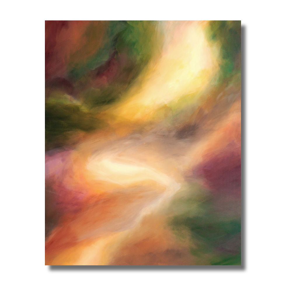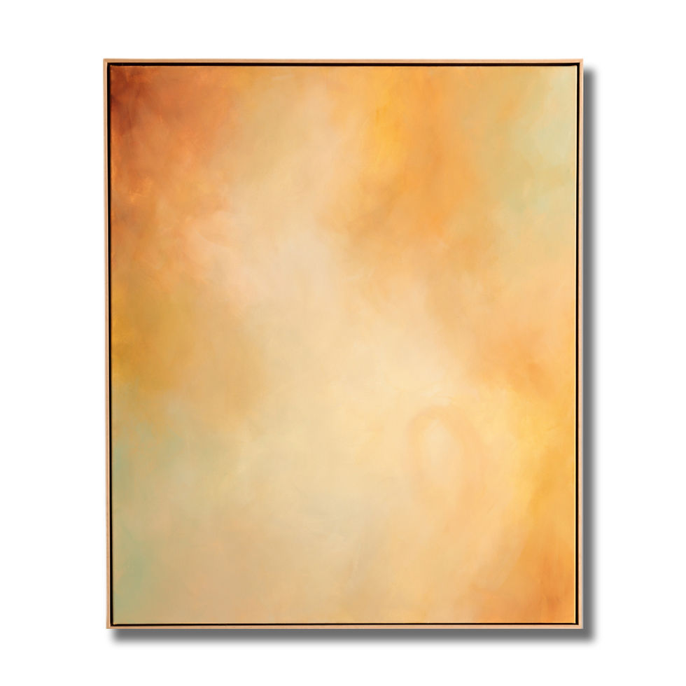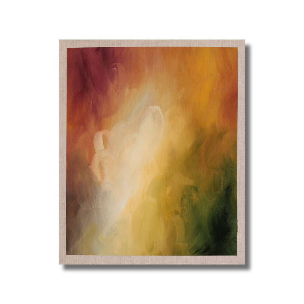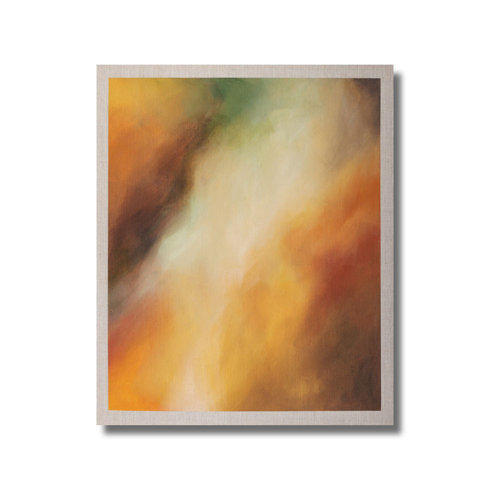 Alongside these are a series of looser, atmospheric abstract works that feel like landscapes filtered through memory rather than direct representation. Soft purples and moss greens are worked into blush and yellow tones in an instinctual way. If the botanical works ask the viewer to look closely, these paintings ask them to exhale- to drift, feel and settle into the atmosphere.